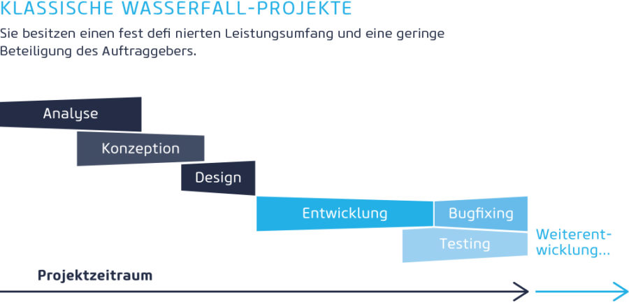 Noch vor wenigen Jahren waren die meisten E-Commerce-Projekte mit der klassischen Wasserfall-Projektmanagement-Methode beherrschbar. Das Wasserfallmodell bietet für die Kunden eine transparente Vorgehensweise. Das Projekt wird in einzelne Phasen gegliedert und in zeitlich sinnvolle Abläufe gebracht. Auch eine Parallelisierung einzelner Phasen ist möglich, um die Geschwindigkeit der Projektumsetzung zu steigern. Diese Phasen schließen jeweils mit einem Meilenstein ab und führen zu einem erfolgreichen Projektende.
